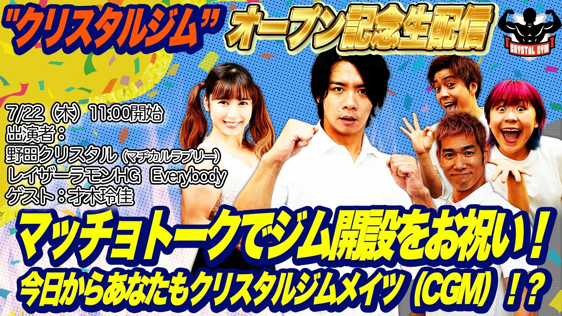 📢\7/21(水)10:00~オンラインチケット発売/💪#クリスタルジム オープン記念生配信!マッチョトークでジム開設をお祝い!今日からあなたもクリスタルジムメイツ(CGM)!?◆7/22(木)11:00~12:00◆出演者 #野田クリスタ...