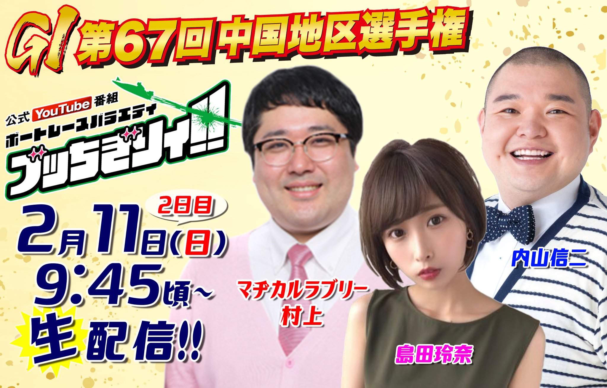 ⛩️ボートレースバラエティ🥳ブッちぎりィ‼️\ GⅠ第67回中国地区選手権(2/10~15) /11日(2日目)の配信は、 #内山信二 さんと、 #島田玲奈 さん、そして宮島配信初出演のボートレース大好き芸人の #マヂカルラブリー村上 さん...